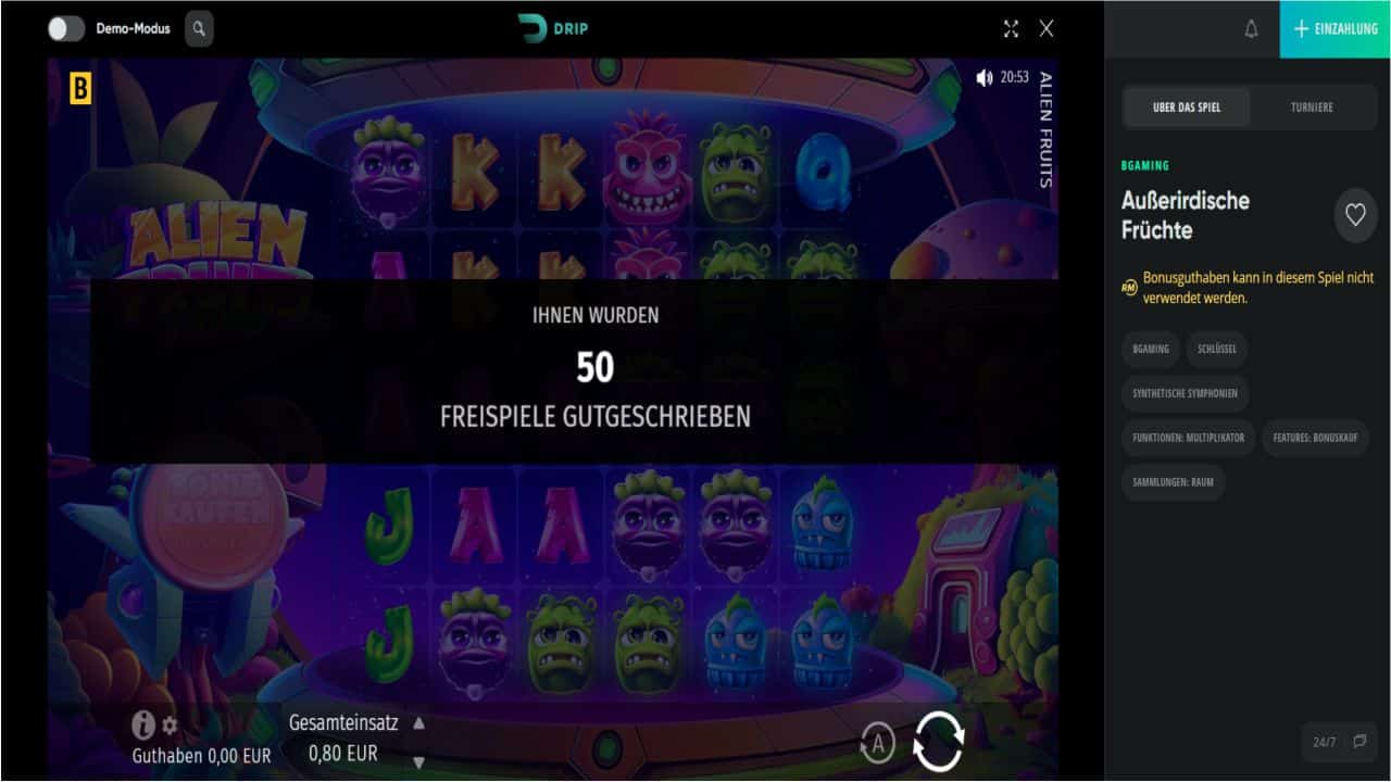 Ein super schönes Casino ist das Drip auf jeden Fall. Ich würde mich über ein festes Bonus-Angebot freuen, statt der kumulativen Angebote. Die 50 Freispiele, völlig gratis haben Spaß gemacht, leider war der Spiel interne Bonus nicht sichtbar. Die Spieleauswahl ist sehr gut, wie immer mit länderspezifischen Einschränkungen. Ganz toll ist die Auflistung der Spielautomaten, die man mit Bonus spielen kann, in einer eigenen Kategorie. Auch super schön ist es, das Sie jedes Spiel im Demomodus ausprobieren können. Toll!
