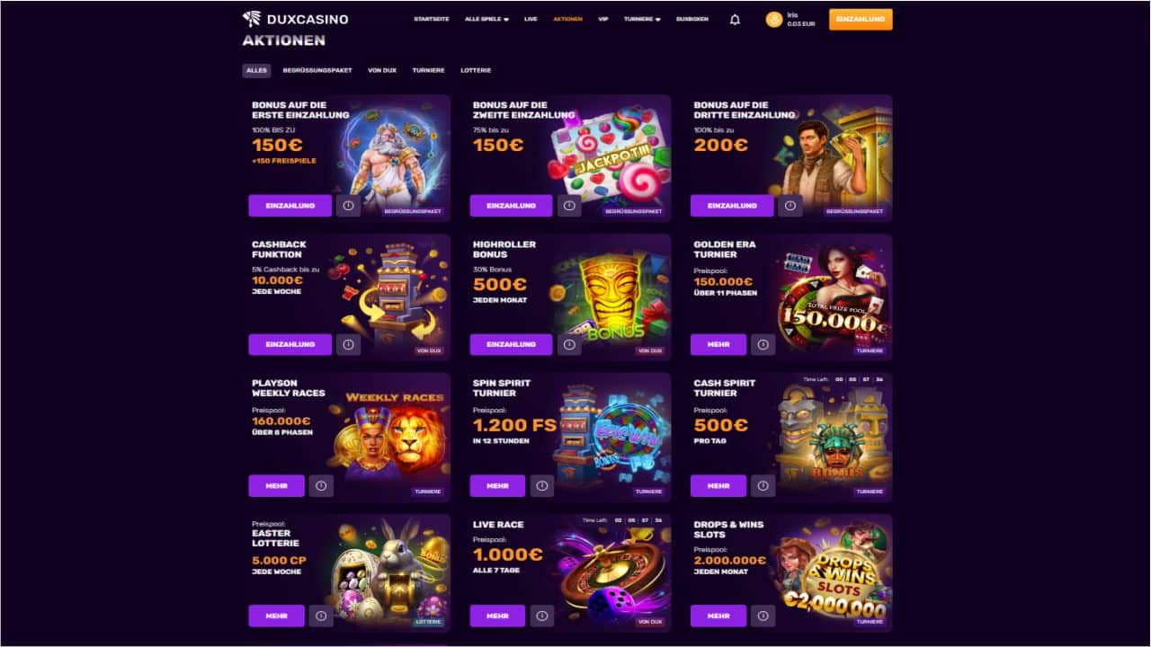 Die komplette Auflistung zeigt das umfassende Angebot vom Dux Casino, der hervorragenden Entwickler von Online-Casinospielen. Alle Spielautomaten, die Sie sich wünschen können, sind eigentlich vorhanden. Dazu Live-Casino Spiele und Tischspiele, wie Roulette, Blackjack und Baccarat.