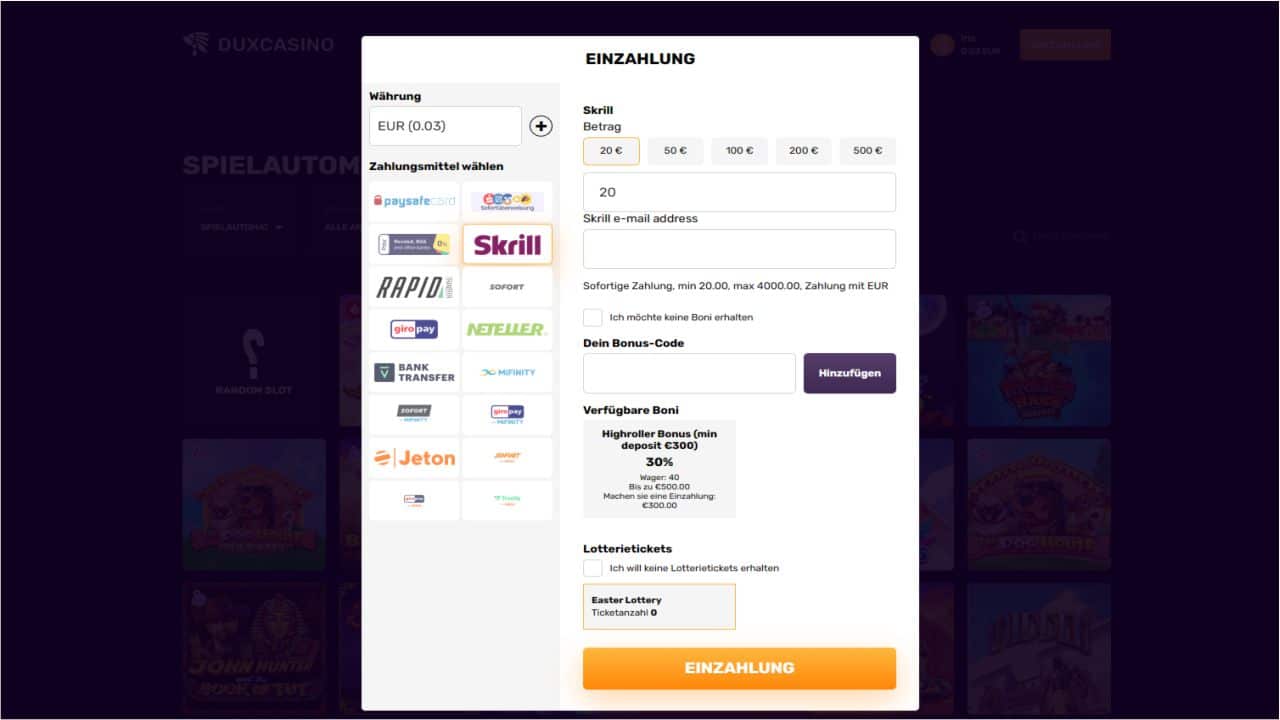Mit Ihrem Spiel hier im Dux Casino und den zugehörigen Gratis-Geldern können Sie loslegen, wenn Sie mindestens 20 € einzahlen. Das die Auszahlung auch schon ab 20 € möglich ist, ist natürlich Spieler freundlich. Sie können bei Bonusnutzung auch schon vorher auszahlen, jedoch werden dann auch alle Gewinne, die Sie erzielt haben, mit gelöscht. Macht also keinen Sinn.