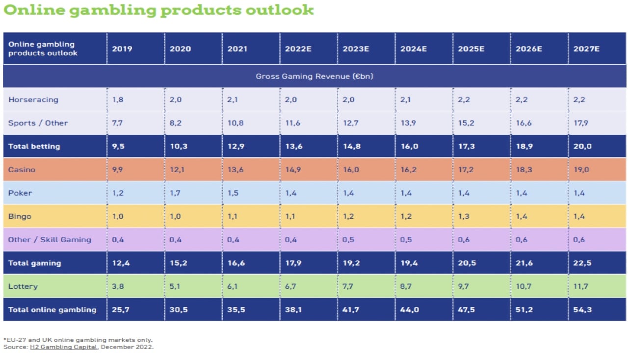 Nach Schätzungen der H2 Gambling Capital werden die Sportwetten-Anbieter und Online Casinos im Internet bis 2027 den Löwenteil beim virtuellen Wachstum abdecken. Online-Poker, Online-Bingo oder Pferdewetten halten hingegen an ihrem bisherigen Umsatzniveau fest.