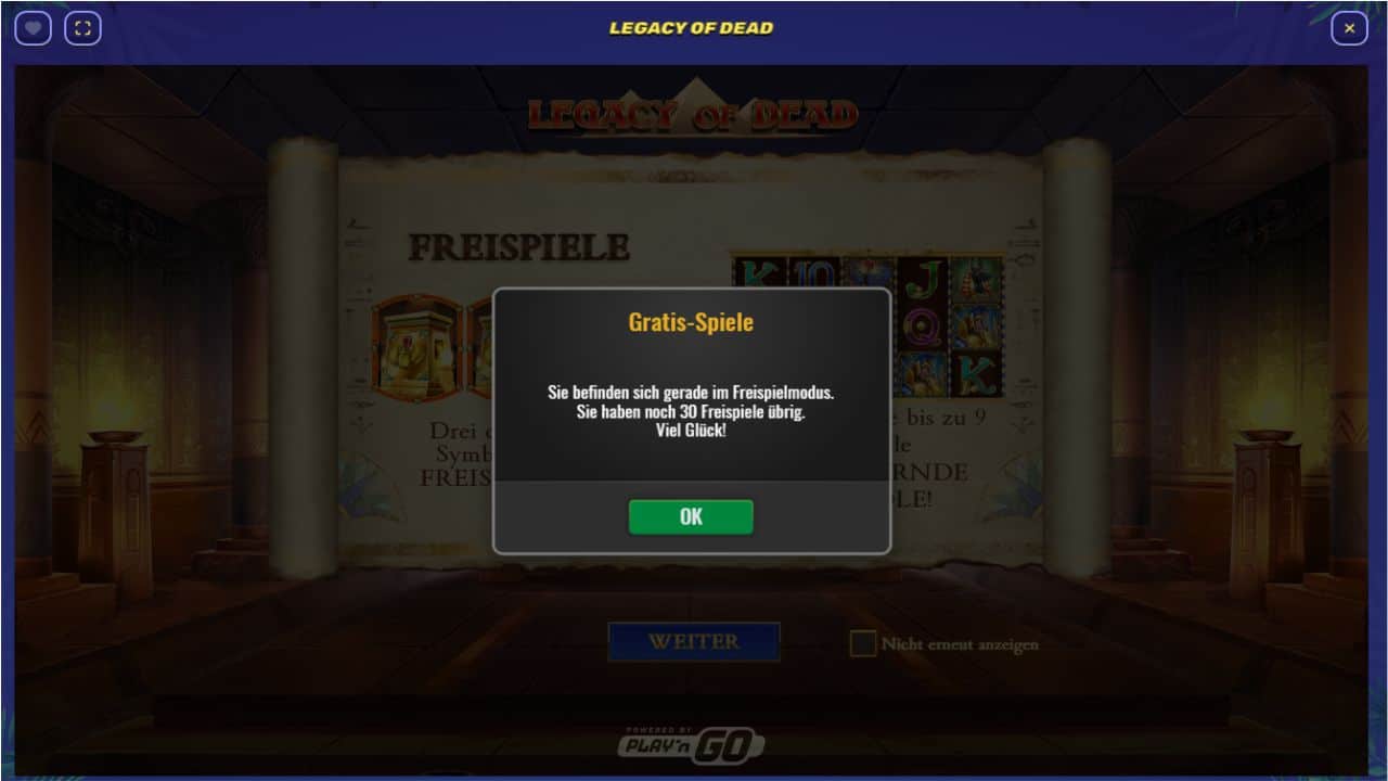 Die Auszahlung der Gewinne aus den Freispielen kann nur maximal 40 € betragen. Dabei müssen Sie den Gewinn aus den Freispielen 40x setzen. Der Spielautomat an dem Sie Ihre Freispiele spielen ist Legacy of Dead von Play’n Go. Das ist doch schon mal ein schöner Slot. Jedoch mit hoher Volatilität, das bedeutet, dass Sie auch nach vielen Drehungen fast nix gewinnen können oder eben ein echt fetter Gewinn herauskommen kann. Bei einem Slot mit 10 Linien und einem Einsatz von 20 Cent pro Dreh, da kann schon was gehen. Viel Glück für alle. Es würde mich freuen, wenn Sie mal Ihre Gewinne in die Kommentare schreiben würden, aber auch ob der Umsatz geklappt hat. Das hilft auch anderen Spielern das Angebot einschätzen zu können. Danke schon mal dafür!
