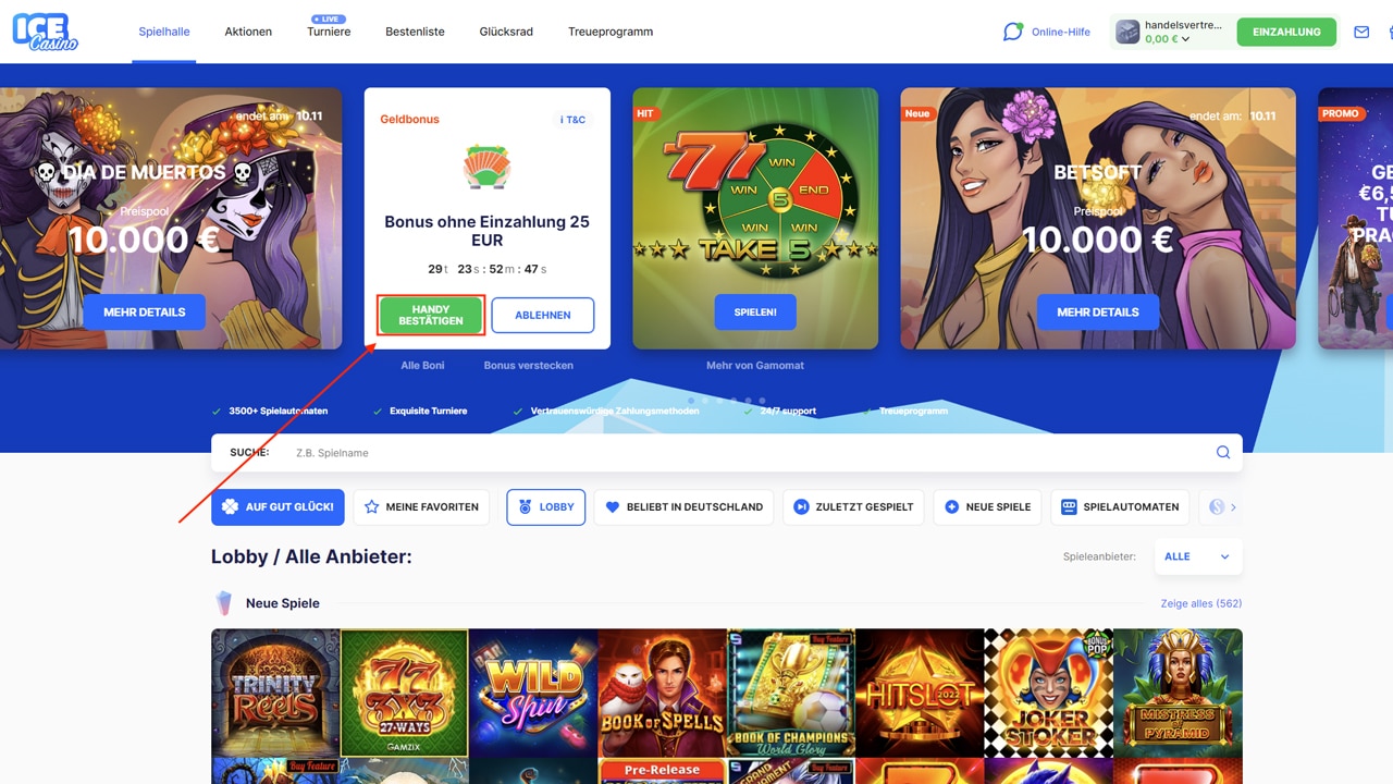 Den SMS-Code geben Sie (siehe Bild) direkt in der Anmeldemaske ein. Daraufhin wird Ihnen das 25 € gratis Guthaben sofort gutgeschrieben. Es gibt nichts weiter zu beachten. Sie können jetzt im ICE Casino ohne Einzahlung mit 25 € spielen. Natürlich unterliegt das Angebot bestimmten Teilnahmebedingungen, die wir Ihnen nachfolgend erklären.