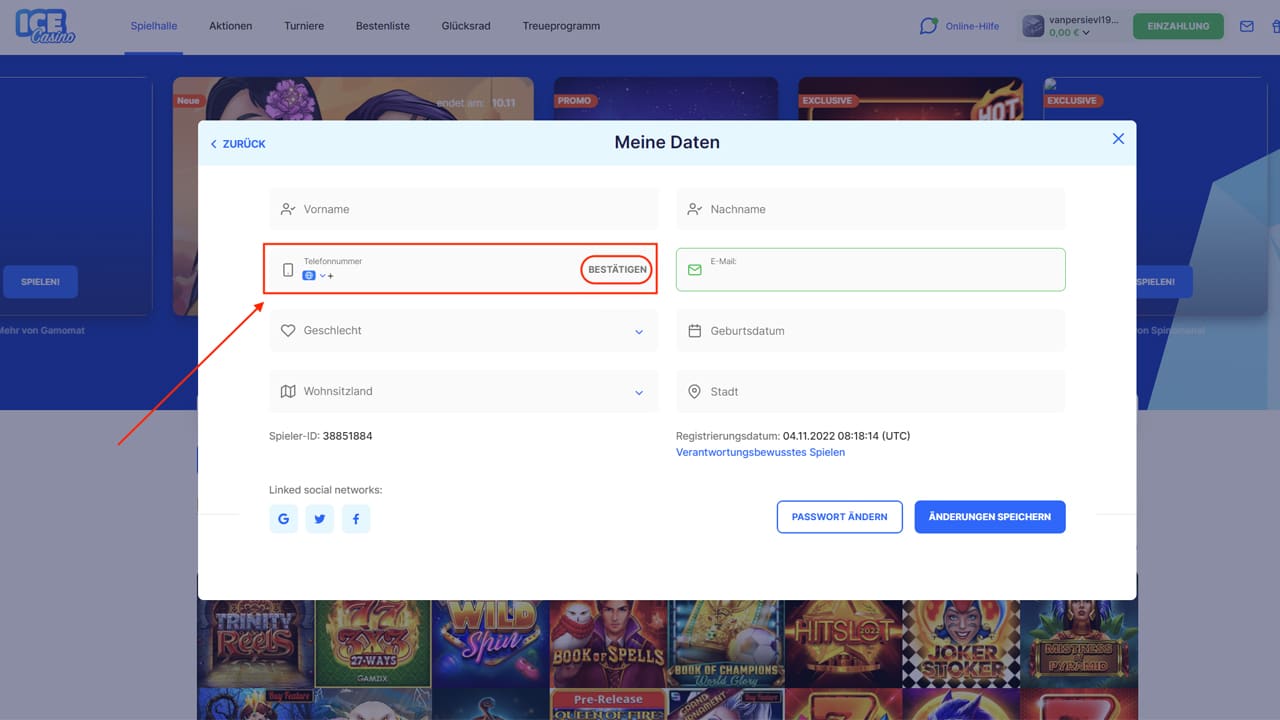 Es öffnet sich nach der ersten Phase der Anmeldung ein neues Fenster, in Folgendes angezeigt wird: „Bitte bestätigen Sie Ihre E-Mail“. Das bedeutet, Sie müssen jetzt zu Ihrem Postfach gehen und dann die ICE Casino E-Mail öffnen . Den darin enthaltenden Link klicken Sie bitte an, mit diesem wird Ihre E-Mail-Adresse bestätigt und sie landen ohne weiteren Login direkt in Ihrem Account. Persönliche Daten sind noch nicht einzugeben. Sie wollen ja die kostenlosen 25 € ohne Einzahlung haben und an dieser Stelle haben Sie noch etwas vor.