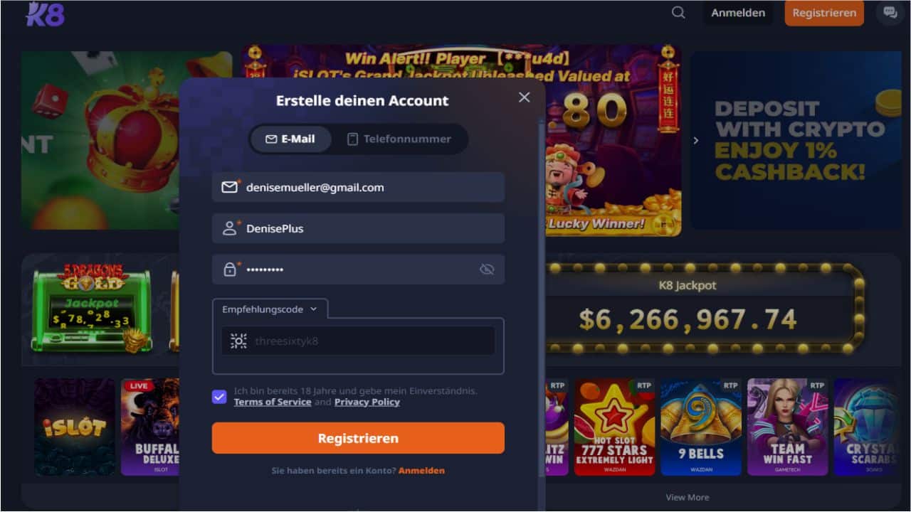Bitte beachten Sie auch hier im K8 gilt nur ein Account pro Haushalt, IP-Adresse, Krypto-Wallet und/oder Kreditkartennummer. Eine falsche E-Mail-Adresse lässt sich auch nicht mehr rückgängig machen.