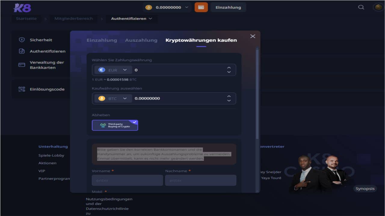 Sie loggen sich über unseren Link auf dieser Seite in das K8 Online Casino ein. Verifizieren die E-Mail und die Handynummer und Ihren Ausweis.