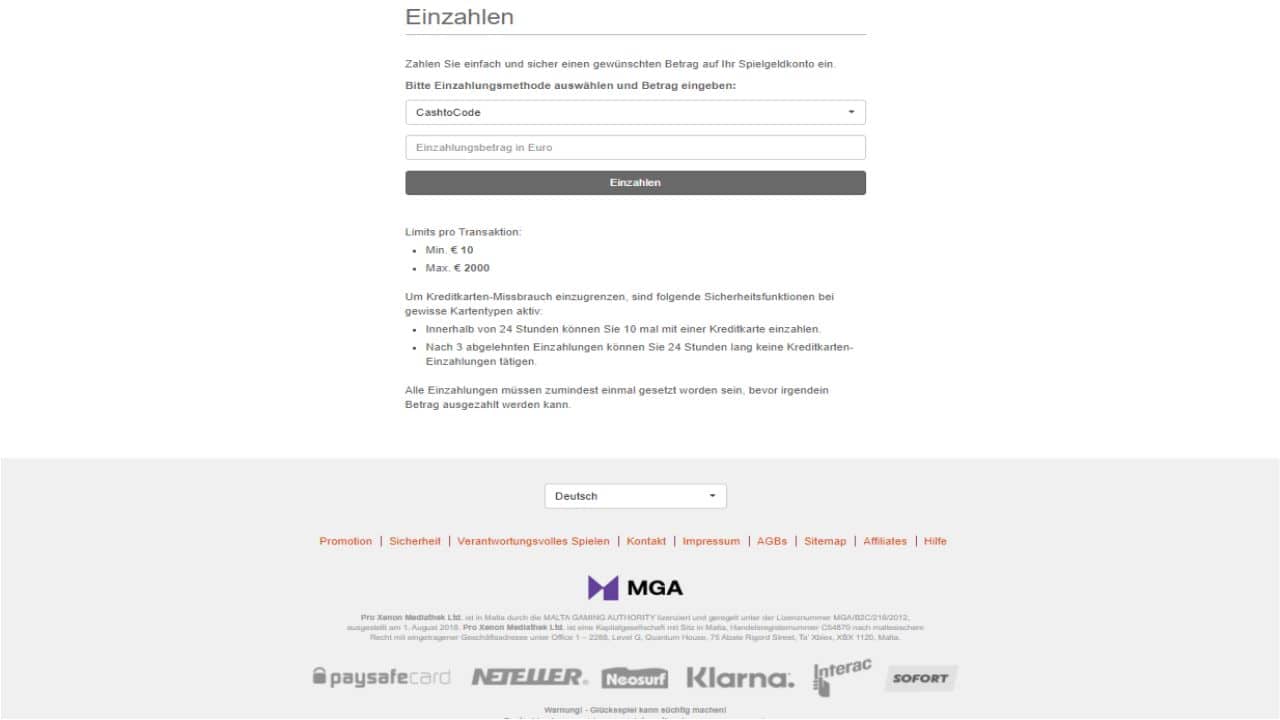 Die Beschreibung der Ein- und Auszahlung fällt auch ziemlich kurz aus. Cash to Code ist verfügbar, das ist natürlich definitiv zu wenig.