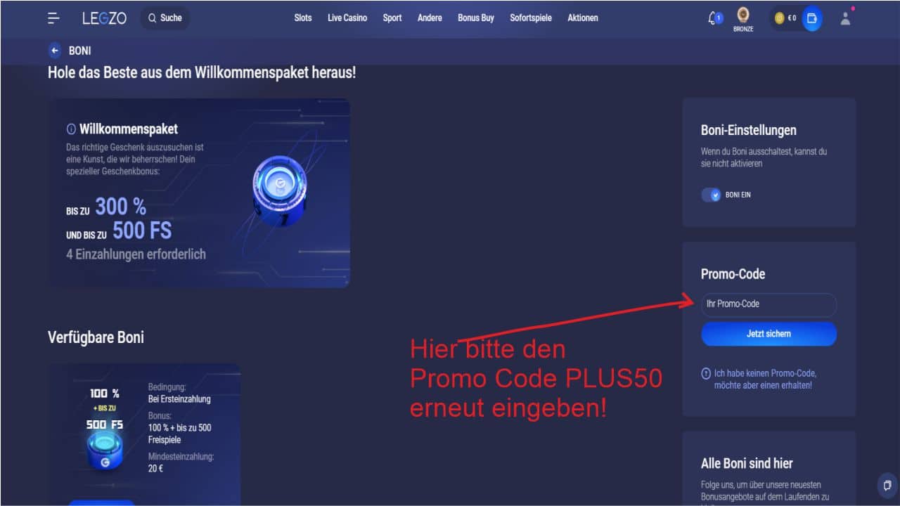 - Geben Sie hier dann schon mit den Klick auf Bonuscode unseren Bonuscode PLUS50 ein
