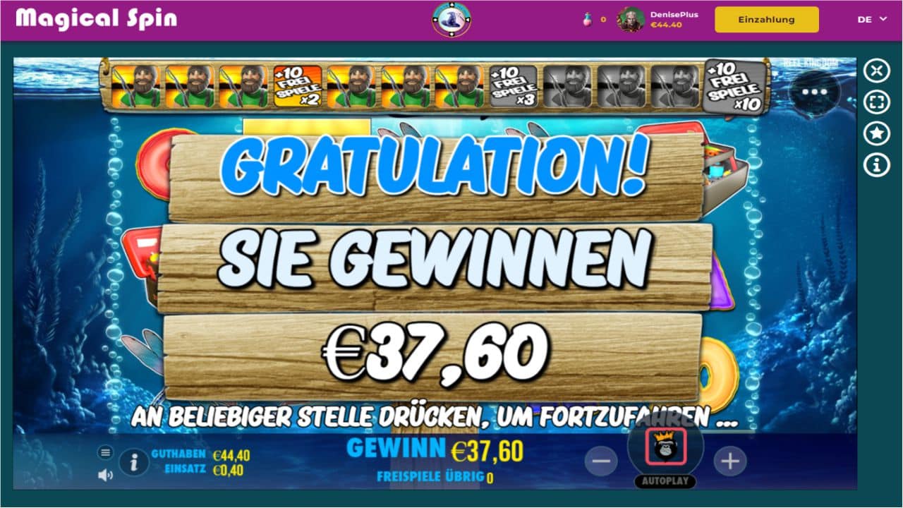 Somit beginne ich mal mit dem gratis Bonus, den Sie hier erhalten. Die 10 € bekommen Sie gutgeschrieben und schon kann es losgehen, mit Ihrem Test des Spiels im Magical Spin Casino. Klar müssen Sie erstmal die Umsatzanforderungen schaffen, doch dann winkt auch schon eine mögliche Auszahlung mit bis zu 100 €. Die Spieler müssen aber erst eine Einzahlung von mindestens 25 € leisten, um eine Auszahlung zu beantragen. Hier im Magical Spin gilt auch das KYC Verfahren und damit erfüllen Sie schon mal einen Teil davon.