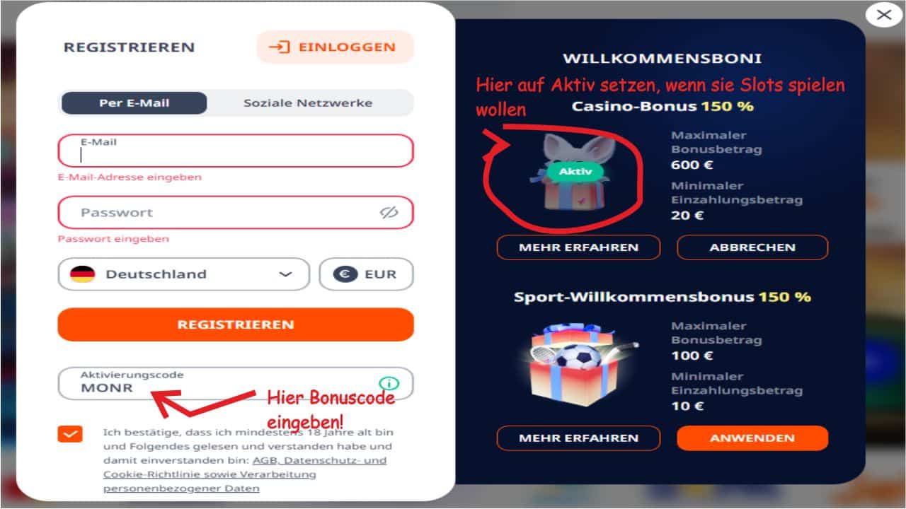 Hier geht alles sehr schnell und problemlos, wenn Sie sich an folgende Reihenfolge halten. Sie melden sich über unseren Link hier auf dieser Seite an. Beachten Sie dabei, dass Sie auch gleich den Bonuscode MONR mit eingeben. Wenn Sie bei der Anmeldung mit Spielautomaten Ihren Willkommensbonus nutzen wollen, achten Sie darauf, den richtigen Haken auf aktiv zu setzen.