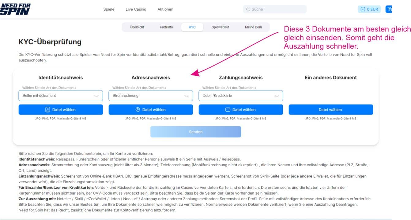 Ganz wichtig: Denken Sie immer daran Ihre persönlichen Daten korrekt anzugeben. Es wird auf jeden Fall ein KYC Verfahren durchgeführt. Spätestens wenn Sie auszahlen wollen, wird das vollständige KYC durchgeführt. Die Zeit die Sie damit verlieren müssen Sie natürlich zur Zeit der Auszahlung dazu rechnen. Das müssen inzwischen fast alle Casinos durchführen. Es bringt auch nichts doppelte Konten anzulegen.