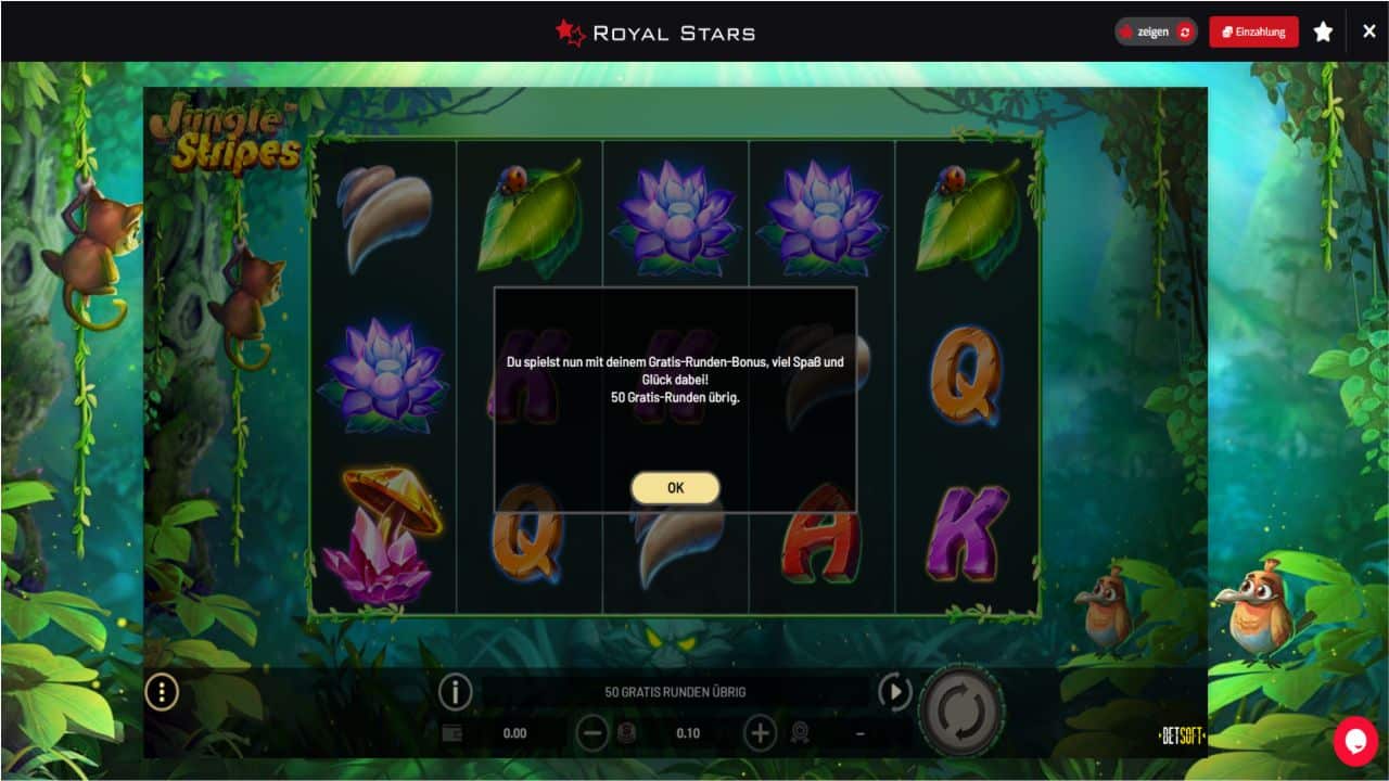 Testen Sie doch schon mal Jungle Stripes oder auch Torro’s Gold mit den 50 Freispielen, die hier komplett ohne Umsatzbedingungen für Sie, mit unserem Bonuscode, bereitstehen. Das neue Royal Stars Casino wurde schon von vielen als bestes neues Casino auf den großen Markt gefeiert. Das natürlich aus guten Grund, denn hier vereinen sich nicht nur Bonusbedingungen, die Sie wählen können, sondern auch Fiat Geld Einzahlungen mit Krypto Einzahlungen. Schnelle Auszahlungen sind immer wieder wichtig für jeden Spieler. Denn die Gewinne sollten ja schnell, für kleine Nettigkeiten genutzt werden können. Das wird hier natürlich auch gewährleistet, jedoch wird die KYC Verifizierung auch vorausgesetzt.