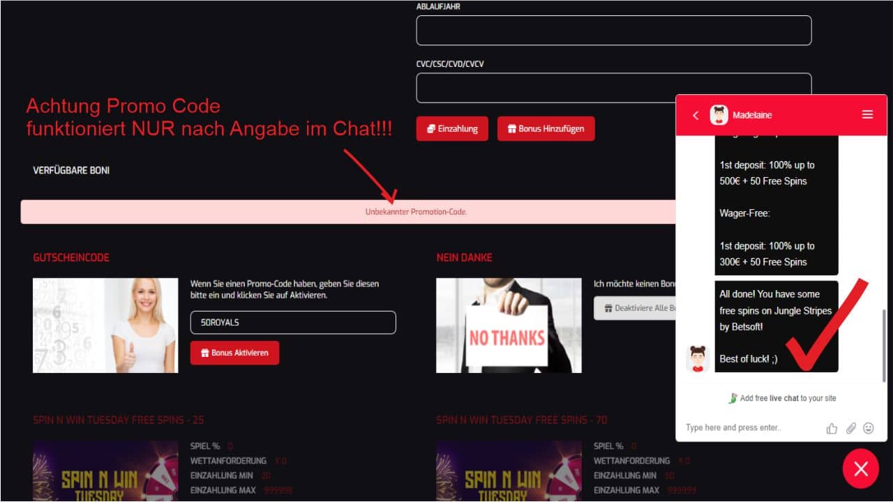 Einen Bonuscode kann man bei der Einzahlung eingeben, dafür herunterscrollen und die Erweiterung aufklappen. Jedoch funktioniert dieser Bonuscode nur über den Chat! Sie müssen den Bonuscode 50ROYALS beim Chat einfordern. Das geht leider fast nur in englisch, also bei Bedarf sofort den „Übersetzungsgoogle“ nutzen. Das Ganze dauert nur wenige Minuten!