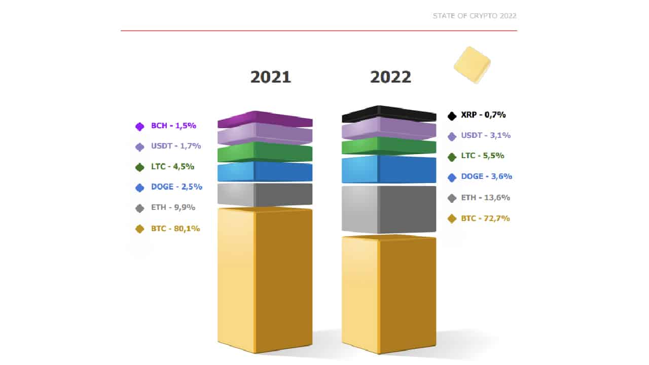 Im Einklang der gesamten Anteile der Digitalwährungen ist die Nutzung von Bitcoin um 7,4 Prozent seit 2021. Erfolgreicher verlief das Jahr 2022 für die ETH, deren Währung stärkte ihre Position um 3,7 Prozent. Die Umstellung von Proof-of-Work zu Proof-of-Stake im September hat den Weg für niedrigere Transaktionskosten und eine höhere Anpassungsfähigkeit. In Bezug auf DOGE, LTC und USDT wachsen die Anteile weiterhin im normalen Bereich.