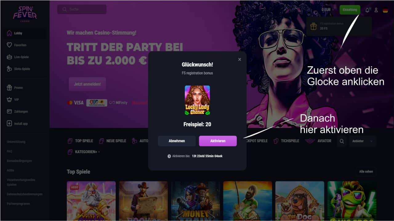 Nach Registrierung bleiben Ihnen 5 Tage, um im Spielkonto den Willkommensbonus zu aktiveren. Sie können Den Zeitraum immer aktiv selbst minutengenau im Spin Fever überprüfen.