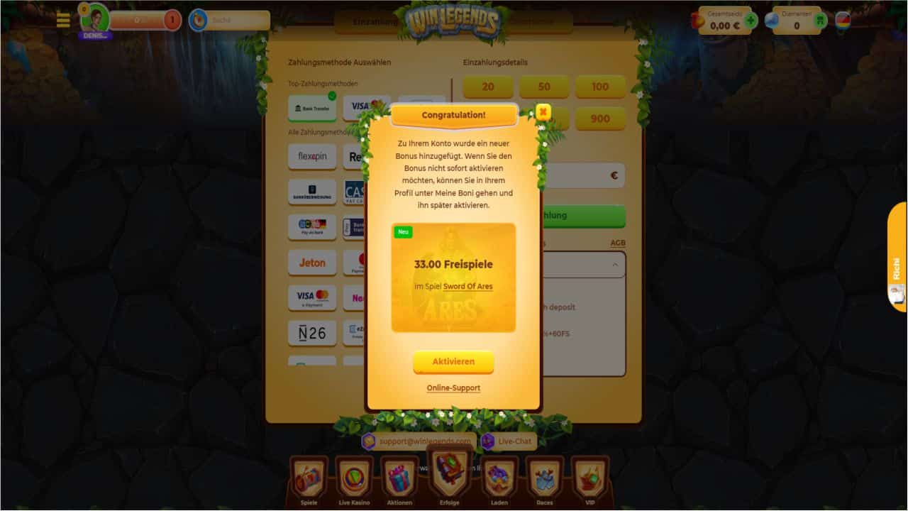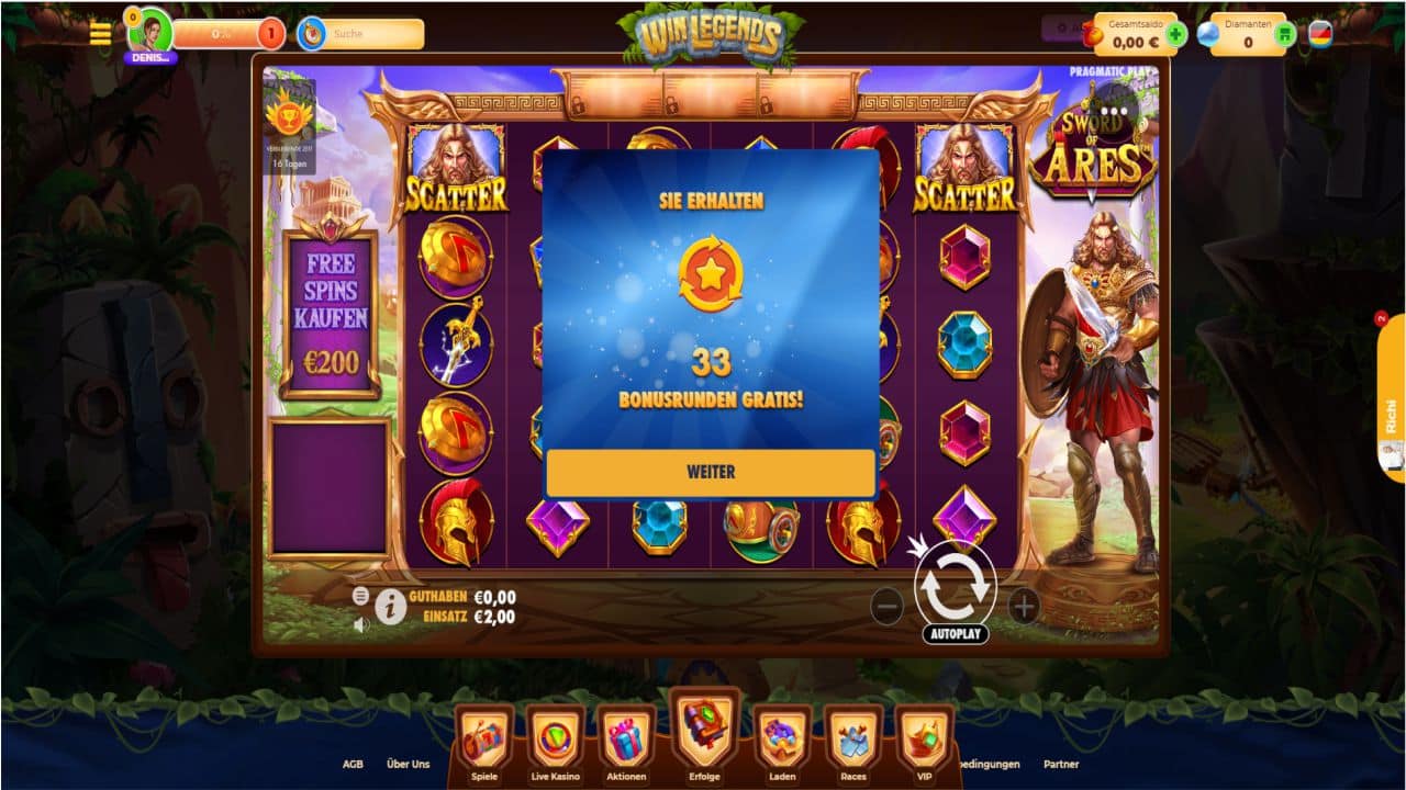 Hier holen Sie sich die 33 Win Legend Casino Bonus Freispiele!