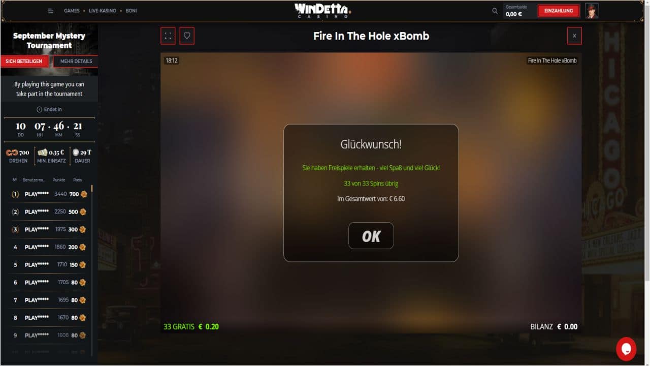 Sie müssen Ihre Gewinne aus den kostenlosen Freispielen natürlich abspielen. Das Windetta verlang dafür 50x Umsatz. Nun kann funktionieren. Bis zu 25 € wären als Cash Auszahlung möglich. Es macht vielmals auch den Reiz aus, das als sportliche Wettbewerb zu verstehen und auch hier und da neue Spiele kennenzulernen. Ich werde nun öfters mal Fire In The Hole xBomb (Nolimit city) und auch den Gewinner Slot (im Nachspiel) Jasmine Dreams von Pragmatic spielen.