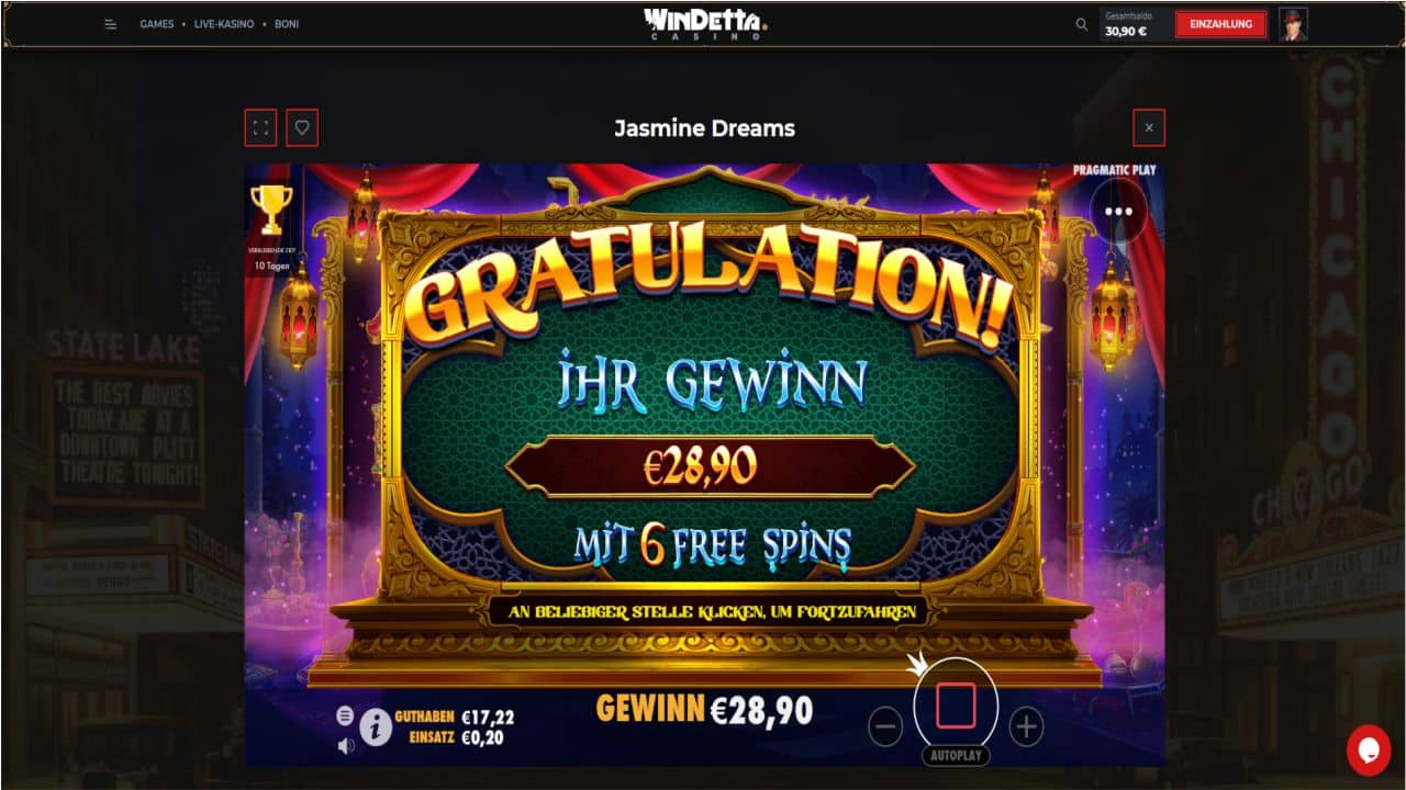 Sie werden auf jeden Fall etwas gewinnen, der eine vielleicht mehr oder weniger. Ein nettes Spiel ist es schon, das Fire In The Hole xBomb (Nolimit City). Jedoch können Sie Ihre Gewinne darauf nicht abspielen, warum auch immer. Ich habe dann den Jasmine Dreams von Pragmatic Play gespielt und siehe da, mit dem Mini-Einsatz von 20 Cent echt gut gewonnen (siehe Bild).
