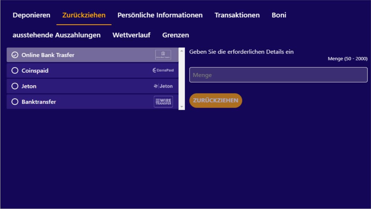 Die Einzahlungen sind stark ausgeprägt, es gibt also viele Möglichkeiten. Dabei sind alle gängigen Möglichkeiten. Achten Sie jedoch auch darauf, mit welcher Methode Sie auch Ihren Gewinn auszahlen können.